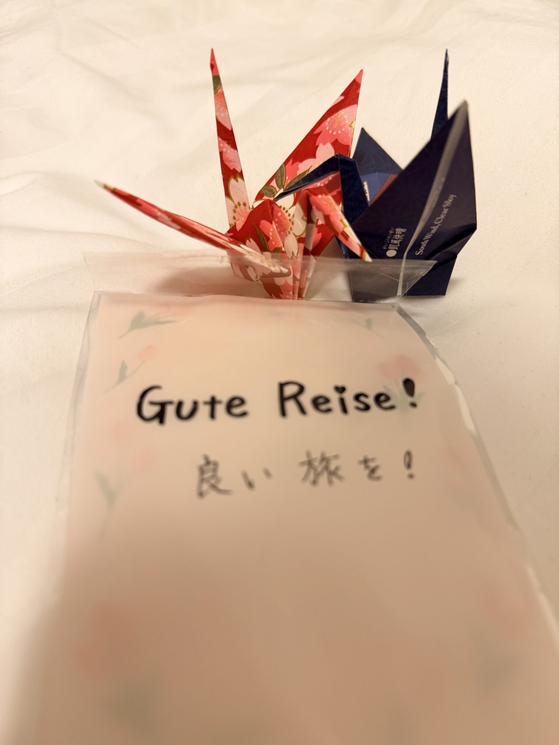Nach dem Museumsrundgang fuhren wir mit dem Bus zurück zum Hafen und danach mit der Fähre nach Takamatsu. Dort begleiteten wir Akihiro-San noch ein Stück, weil wir uns bei seiner Frau bedanken wollten. Sie hat uns Origami Kraniche gebastelt und ich war sofort verliebt in diese kleinen Kunstwerke. So herzliche Menschen. Wir waren beide einfach nur hin und weg.