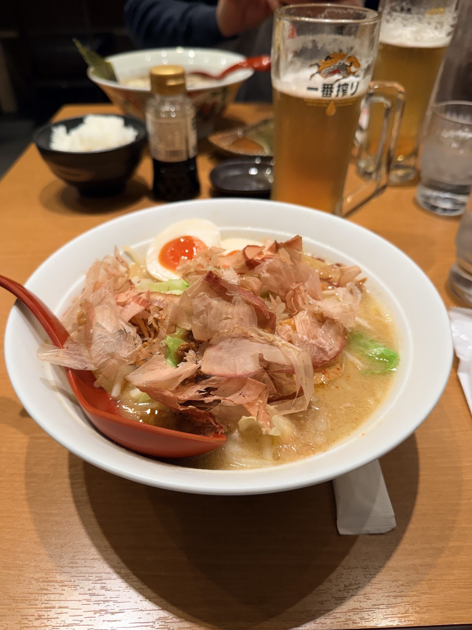 Weil es immer noch frisch war, sind wir zum Aufwärmen auch noch Ramen essen gegangen. Ich musste mal wieder über meinen Schatten springen: Bestellt hab ich Gemüse-Miso-Ramen, bekommen hab ich Gemüse-Miso-Ramen, aber oben drauf gefühlt zwei Kilo Bonitoflocken und ein paar Brösel Faschiertes. Der Kampf „Vegetarier in Japan“ ist real. Ich schubse das Zeug einfach weg, oder schubse es Fritz rüber und rede es mir schön. Hilft. Meistens, weil sonst muss ich hier Hunger leiden. Vorhin im Supermarkt war das einzig vegetarisch gefüllte „Weckerl“ ein Dreierpack Tramezzini… eines mit Ei, eines mit Thunfisch und eines mit Schinken. hahahaha
