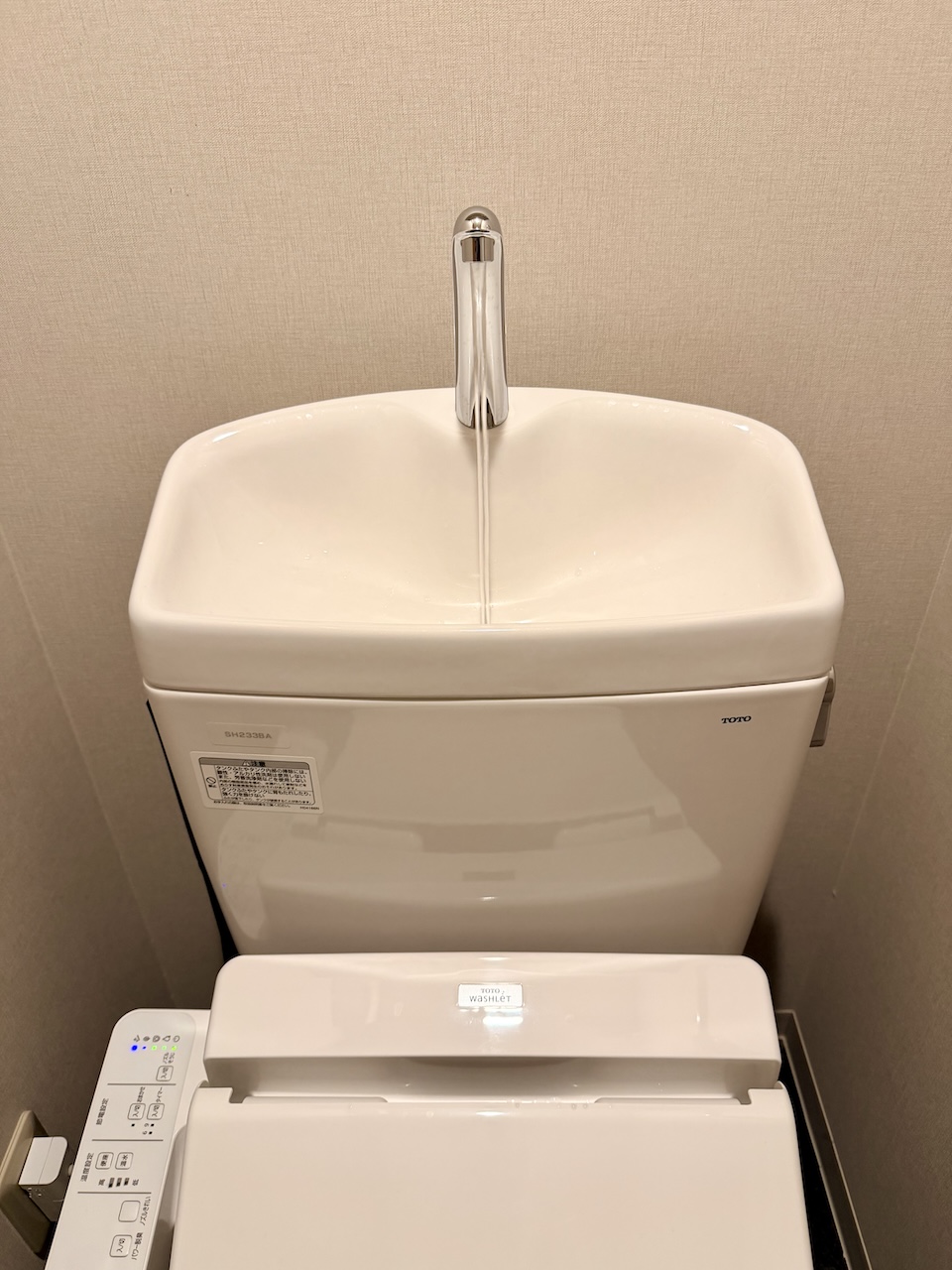 Wenn man spült, läuft frisches Wasser über ein Waschbecken in den Spülkasten, und dort kann man sich direkt die Hände waschen.