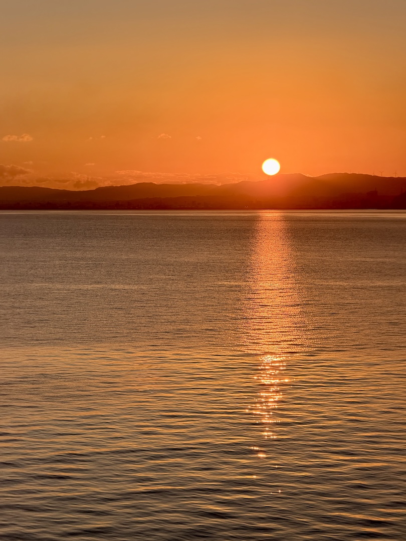 Um 6:51 Uhr standen wir wie zwei topmotivierte Frühaufsteher vor unserem Panoramafenster, halb verschlafen, aber hellwach genug, um den Sonnenaufgang über dem Meer zu bestaunen. Und ja: Meine Lieblingsplatz-See-Vermissung hat sich schlagartig gelegt. So ein Farbenspiel am Morgen kann was und ist einfach viel schöner als der Sonnenuntergang.