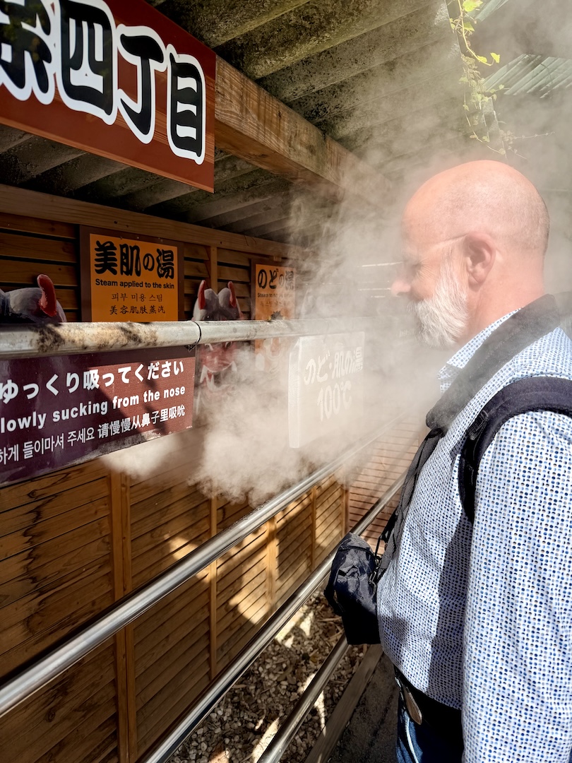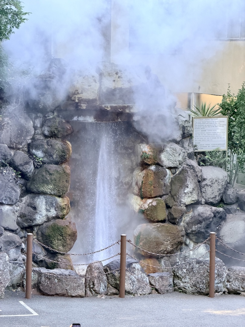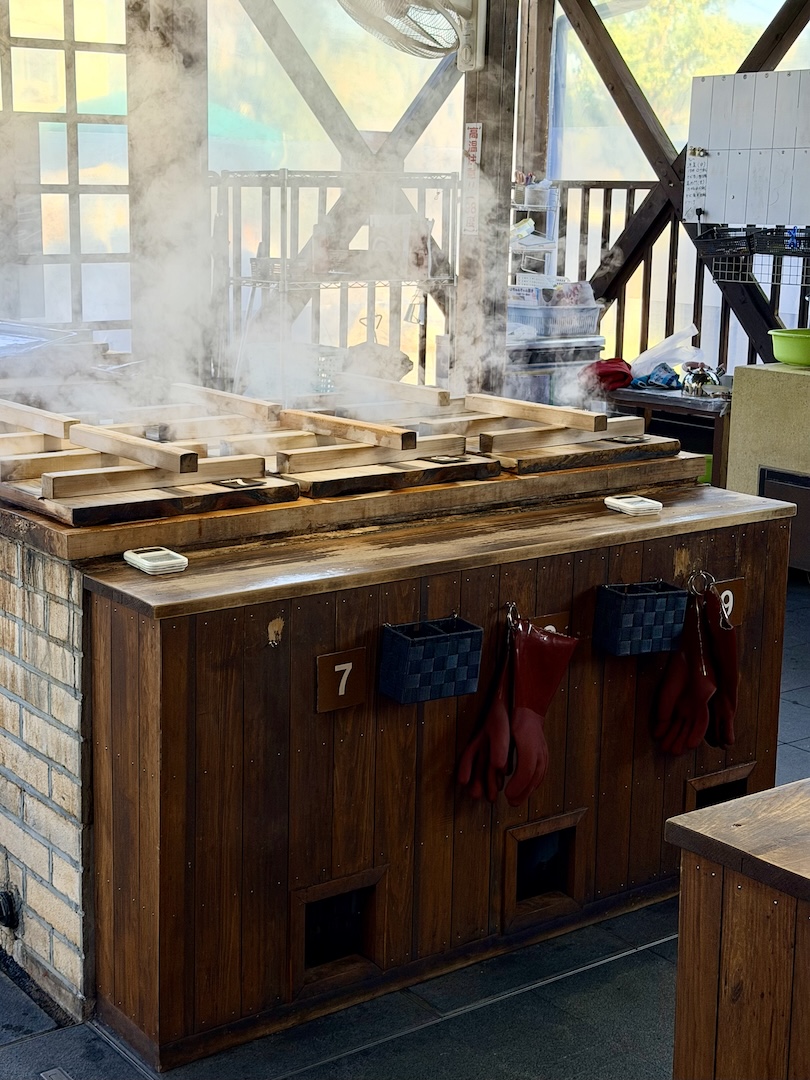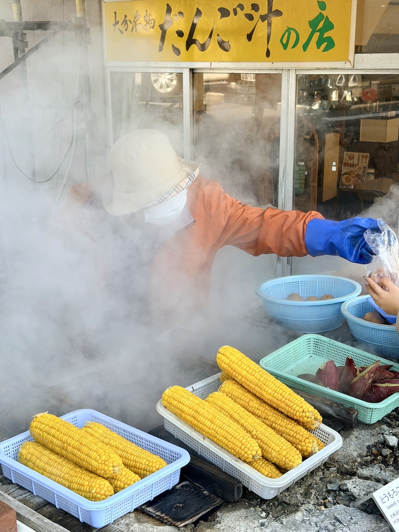 Bei einem Jigoku haben wir den Leuten beim natürlichen Dampfgaren zugeschaut. Da wird alles in Erdloch-Style gegart: Mais, Süßkartoffeln, Eier und sonstige Überraschungen, aber es war uns zu viel los und wir wollten dort nicht warten.