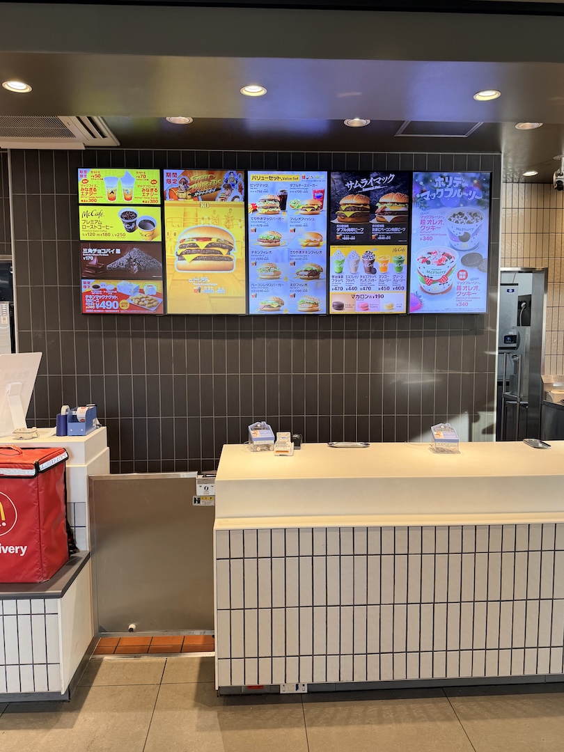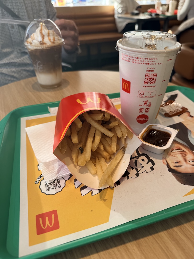 Alles andere: Einfach anders. Japan halt. Anders ist auch, dass mich dort zwei Damen, die sichtlich schon weit über 70 waren, bedient haben. Das fällt in Japan total oft auf, dass noch sehr viele Ältere arbeiten, oder halt leider arbeiten gehen müssen. Ich hab mir Pommes & Cola gegönnt, Fritz hat sich einen Karamell-Macchiato ins Getriebe gestellt, und wir haben beschlossen, dass dieser kurze Zwischenstopp offiziell als „kultureller Erfahrungsaustausch“ gilt. Haha