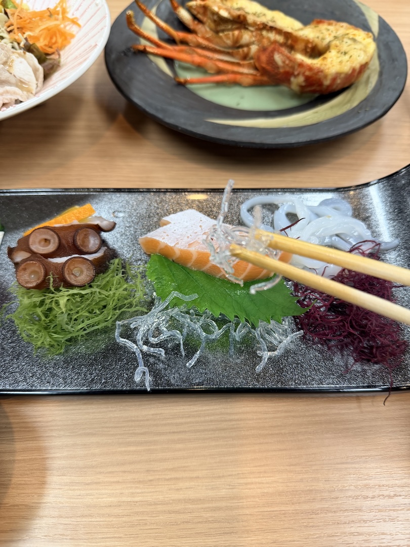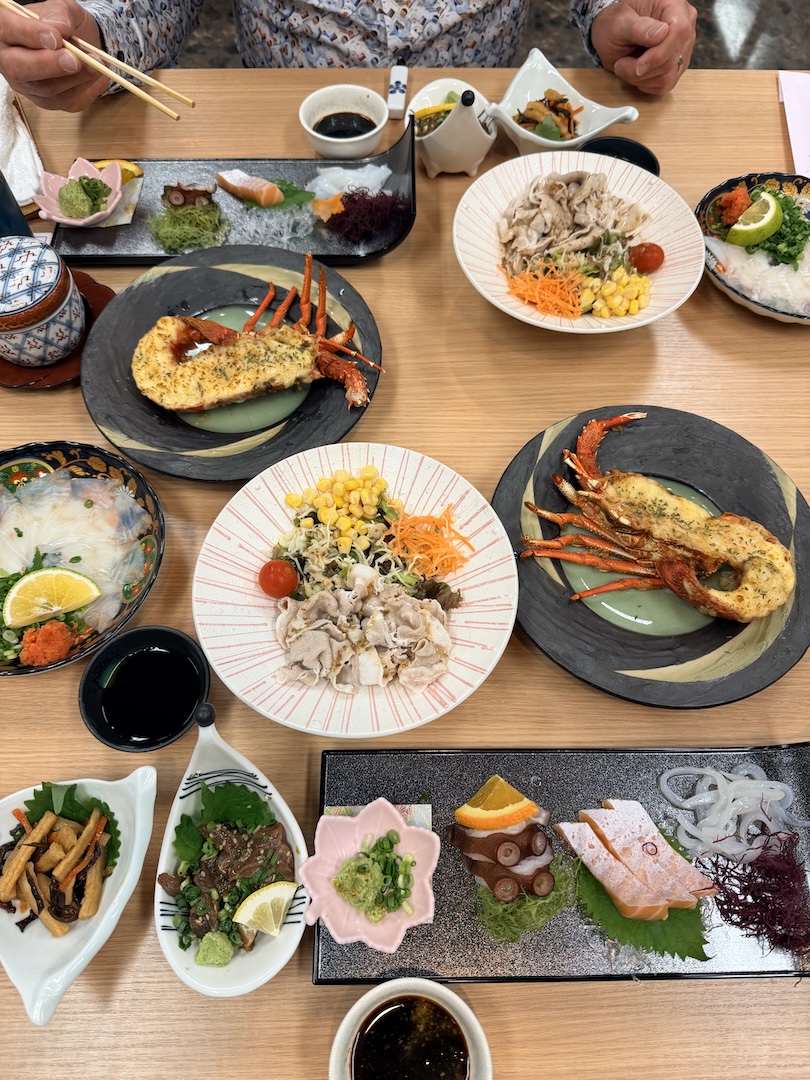 Was ich identifizieren konnte: Salat mit Schweinefleisch oben drauf, japanischen Lobster (der war irgendwie gratiniert und echt mega), Sashimi (Fritz hat sich wieder über ein Stück Tintenfisch getraut, aber ich konnte den gestern schon kaum beißen – roh ist das echt wie Schuhsohle), Fisch eingelegt in Soja und Sesamöl, japanische Algen (grüne, durchsichtige und violette), hauchdünn aufgeschnittenen rohen Fisch mit einer Rettich/Chili/Paste und Ponzu-Soße, gedämpftes Ei mit irgendwas anderem drinnen, dann gebackenen Fisch mit Algen-Curry, Reis und Miso-Suppe mit einer ganzen Jakobsmuschel… zum Glück gab es zum Dessert nur ein Stück Melone. Ich hätt nix mehr runtergebracht.