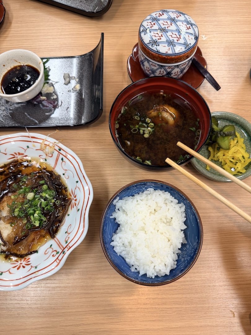 Japanisches Frühstück ist ohnehin ein Erlebnis für sich, aber besonders cool war wieder das Ham-&-Eggs-Selberkochen direkt am Tisch. Mein Stück Ham ist natürlich zu Fritz gewandert (wie immer), aber das Mini-Herdplatte-Eierbraten macht einfach jedes Mal Spaß. Japan denkt an alles.