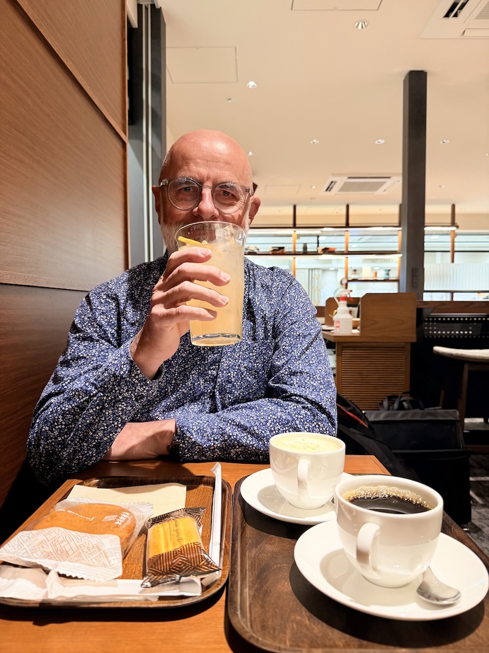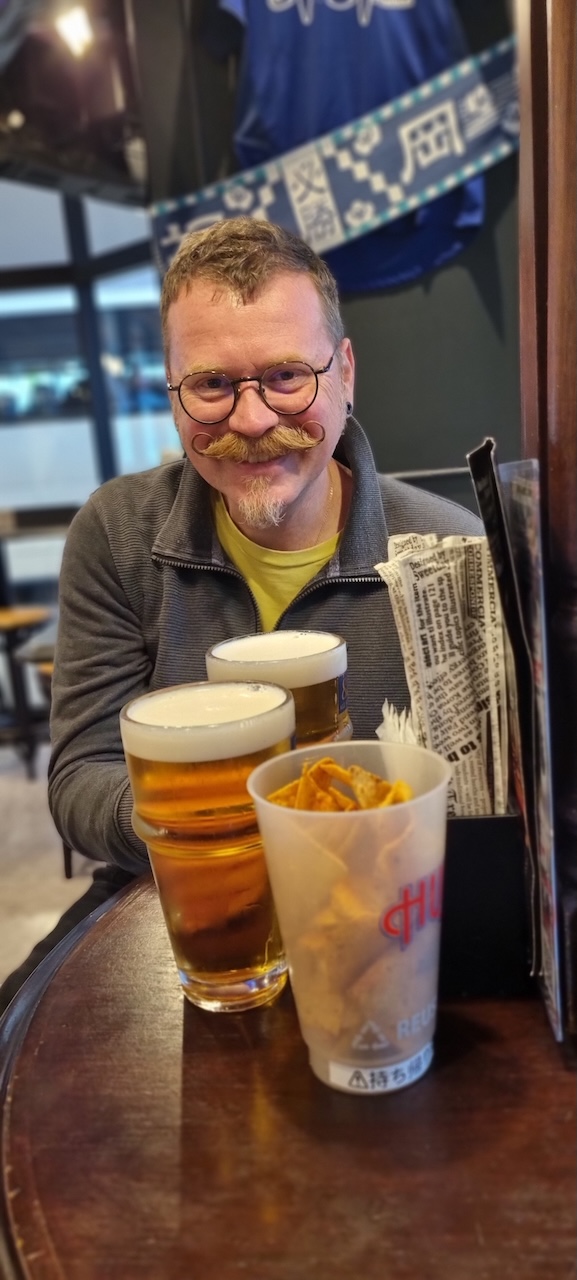 In Hakata angekommen, holten wir uns aber erst einmal einen Kaffee. Ich fand tatsächlich haargenau denselben Coffeeshop wieder, in dem wir schon vor ein paar Tagen waren. Scheinbar ist mein kulinarischer Orientierungssinn besser als jeder Kompass. Und dann las ich, dass es irgendwo in diesem Monsterbahnhof ein Bierlokal gibt. Wir fanden es allerdings nicht. Der Bahnhof ist einfach viel zu riesig. Gefrustet sind wir dann vor dem Bahnhofgebäude gelandet, aber taaaaadddaaaaa, ich erblickte ein Schild mit „British Pub“. hahaha Schwupps waren wir drinnen und es ziiiiischte. 🙂 Nach einem Bier ging die Fahrt dann schon los nach Kagoshima.