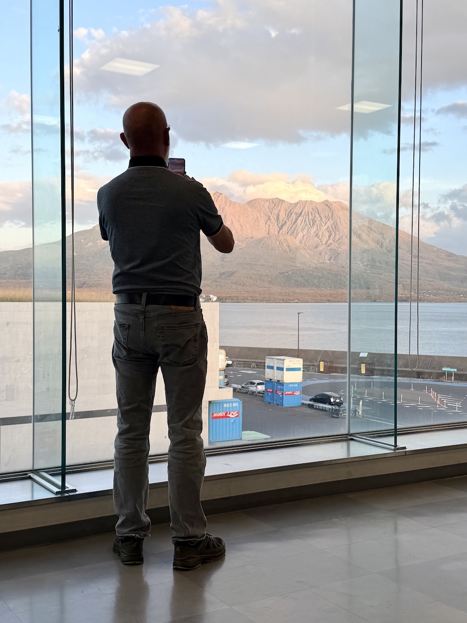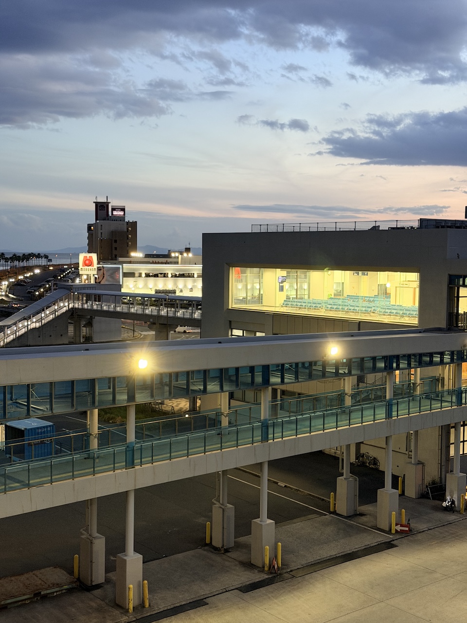 Wie schon angekündigt, war die gestrige erste Amtshandlung der Kauf von Medikamenten gegen die Seekrankheit. Wir hofften ja beide, dass wir das Zeug nicht brauchen. Nach dem Medikamentenkauf sind wir wieder zur Aussichtsplattform im Shiroyama Park gegangen. Boah, sah der Vulkan Sakurajima gefährlich aus. Dicker Rauch qualmte aus seinem Krater, der sich mit den Wolken mischte. Stellenweise sah es wirklich aus wie in einem Ghostbusters-Film. Wir sind dann ungefähr 12.000 Schritte herumgewatschelt und haben schließlich eine nette Bar mit Außenbereich gefunden. Meine Nase findet sowas überall auf der Welt, aber gerade in Japan ist das jedes Mal ein Stunt, weil fast alles nur indoor ist. Außenbereiche gibt es zwar, aber die sind eher selten. Nach einem kleinen Snack haben wir uns dann auf den Weg zur Einschiffung in den Hafen von Kagoshima gemacht.