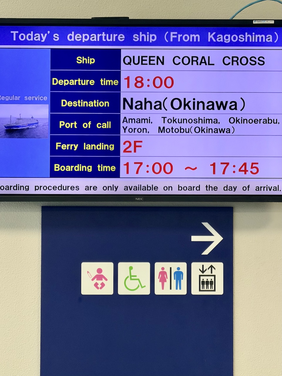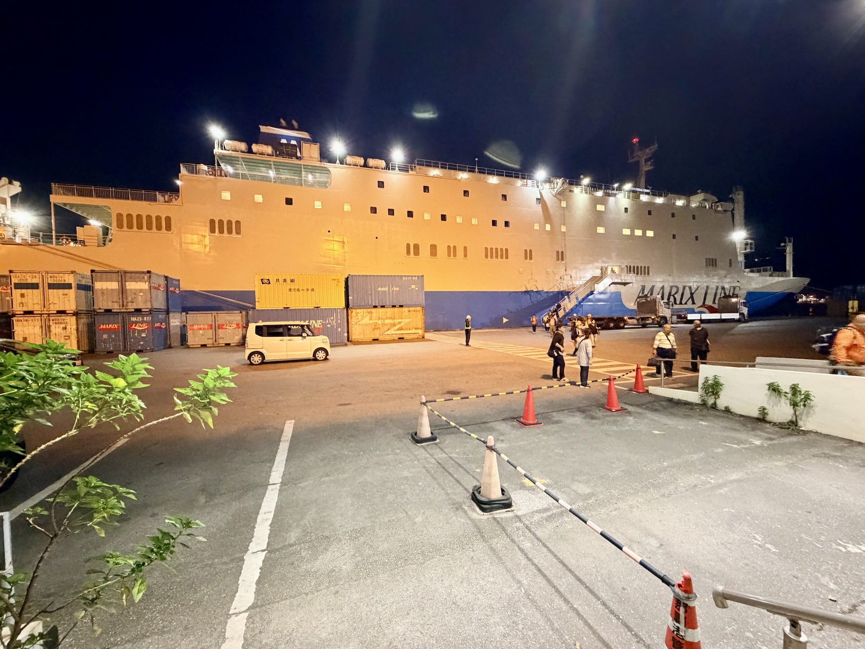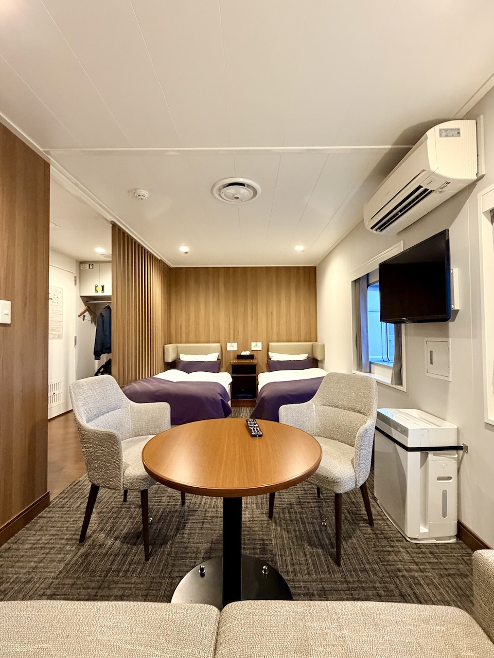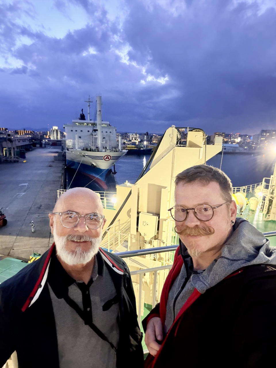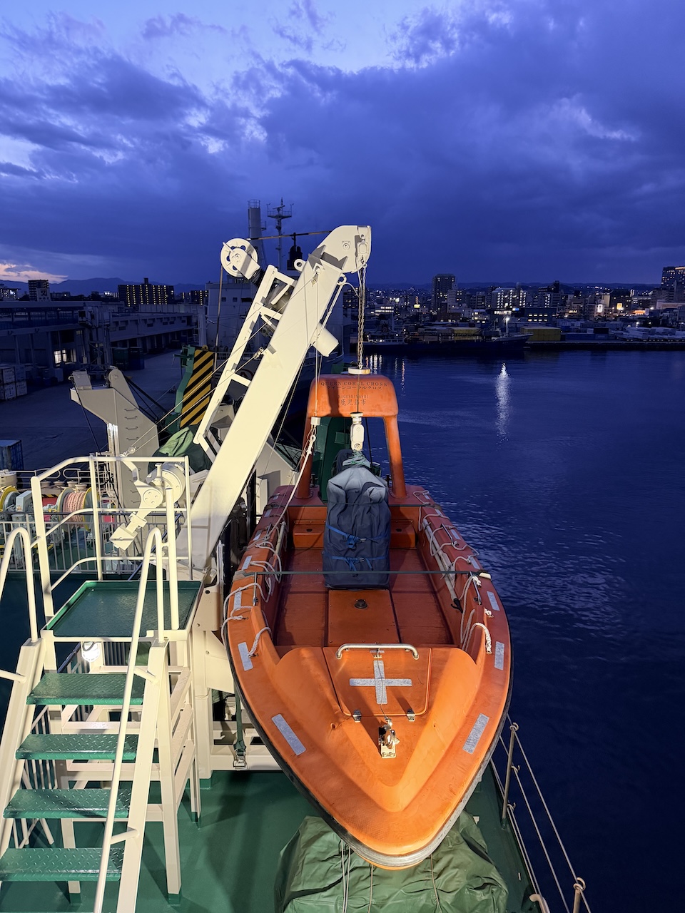 Es waren sehr wenig Menschen beim Gate und die paar, die wir gesehen haben, sahen aus wie richtige alte Seebären. Oh Jesus, meine Nervosität stieg. Später waren dann viel mehr Menschen an Board. Wo die vorher alle waren, keine Ahnung. Wir haben ja beide keine Ahnung, ob wir seekrank werden oder nicht und das ist irgendwie ein mulmiges Gefühl. Im Worst Case hätte es mir oder Fritz von 26 Stunden Schifffahrt 25,5 Stunden elendig gehen können. Wir sind dann allerdings losgefahren und alles war ruhig. Schlaubischlumpf, der ich bin, habe ich natürlich die Premiumkabine gebucht. Ich hab mir gedacht: „Alter, wenn die Kabine zwar ein Tick teurer ist, aber ich hab mein eigenes Häusl zum Speiben – hahaha!“ Ja, der Spaß hat 200 € pro Person gekostet. Wenn ich daran denke, dass wir für den Rückflug nach Tokio in ein paar Tagen 73 € bezahlen, ist das zwar heftig, aber das Abenteuer war es uns wert.