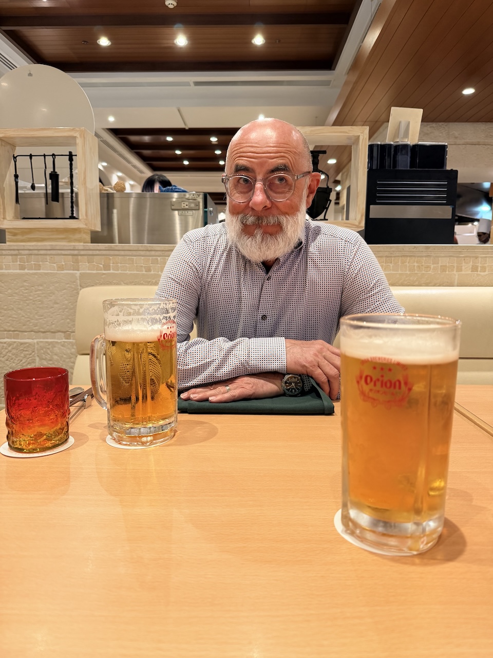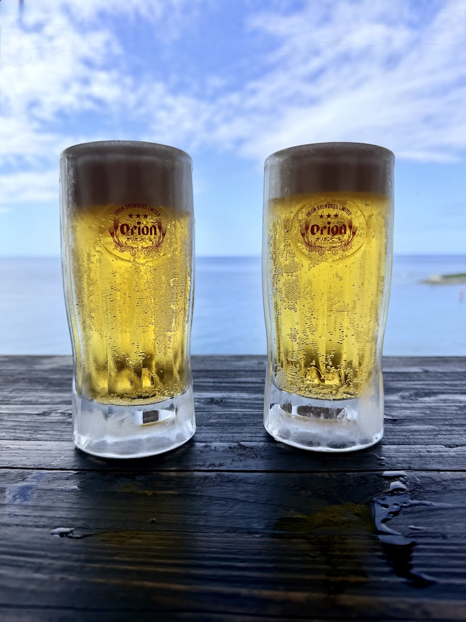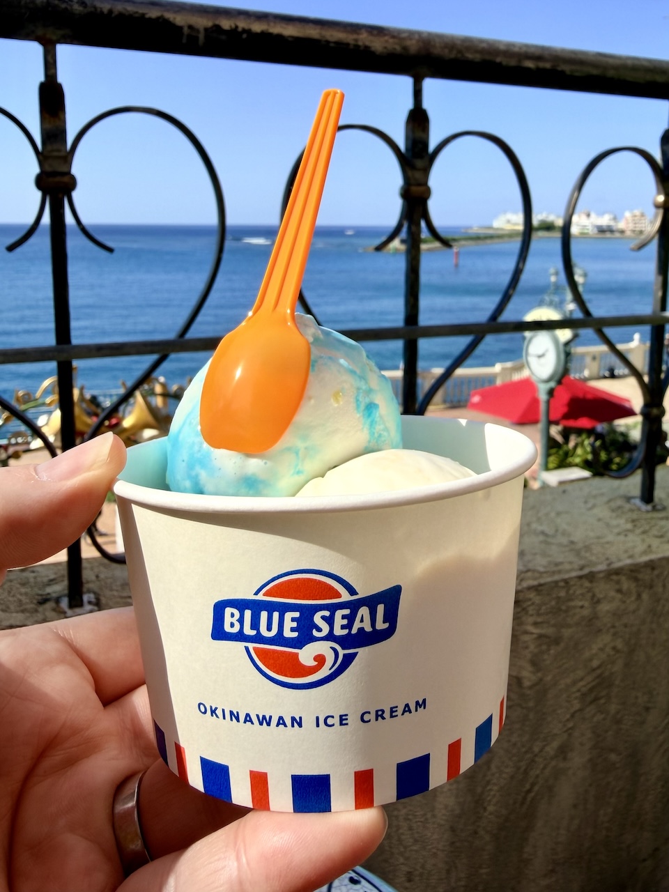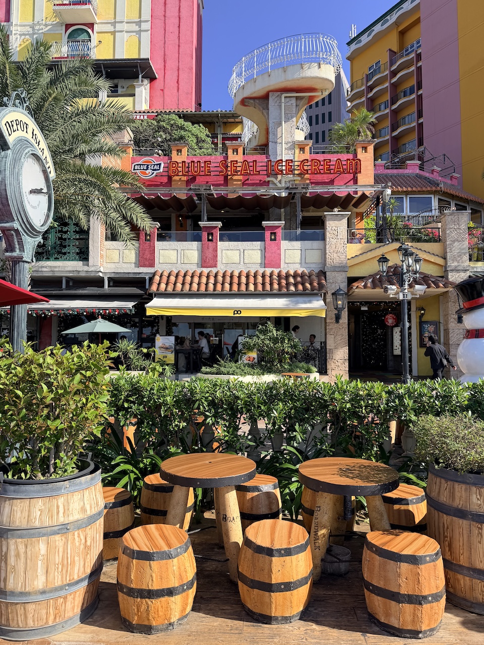 Vom Hotel ging es für uns ins American Village. Dieser Ort ist ein faszinierendes Kuriosum. Er entstand rund um die ehemaligen US-Militärbasen, die hier jahrzehntelang das Stadtbild geprägt haben und zum Teil noch immer prägen. Heute ist das American Village eine bunte Mischung aus künstlicher Strandpromenade, Popkultur, amerikanischem Flair, Neonreklamen, Boutiquen, Burgerbuden, Streetfood und teilweise ziemlich kitschigen, aber irgendwie liebenswürdigen Fotospots. Ein bisschen fühlt es sich an wie ein Freizeitpark ohne Fahrgeschäft. Es ist voll mit Souvenirshops, die wirklich alles verkaufen, was nicht bei drei auf den Palmen ist. Wir sind gemütlich herumgebummelt, haben einiges gekauft, haben uns ein eiskaltes Orion Bier, DIE Biermarke hier auf Okinawa, gegönnt und natürlich das berühmte Blue Seal Eis probiert. Und wow… ich hab viel darüber gelesen, aber jetzt weiß ich, dass es wirklich ultra gut schmeckt. Selbst Fritz meinte, dass es das beste Eis war, das er dieses Jahr gegessen hat.