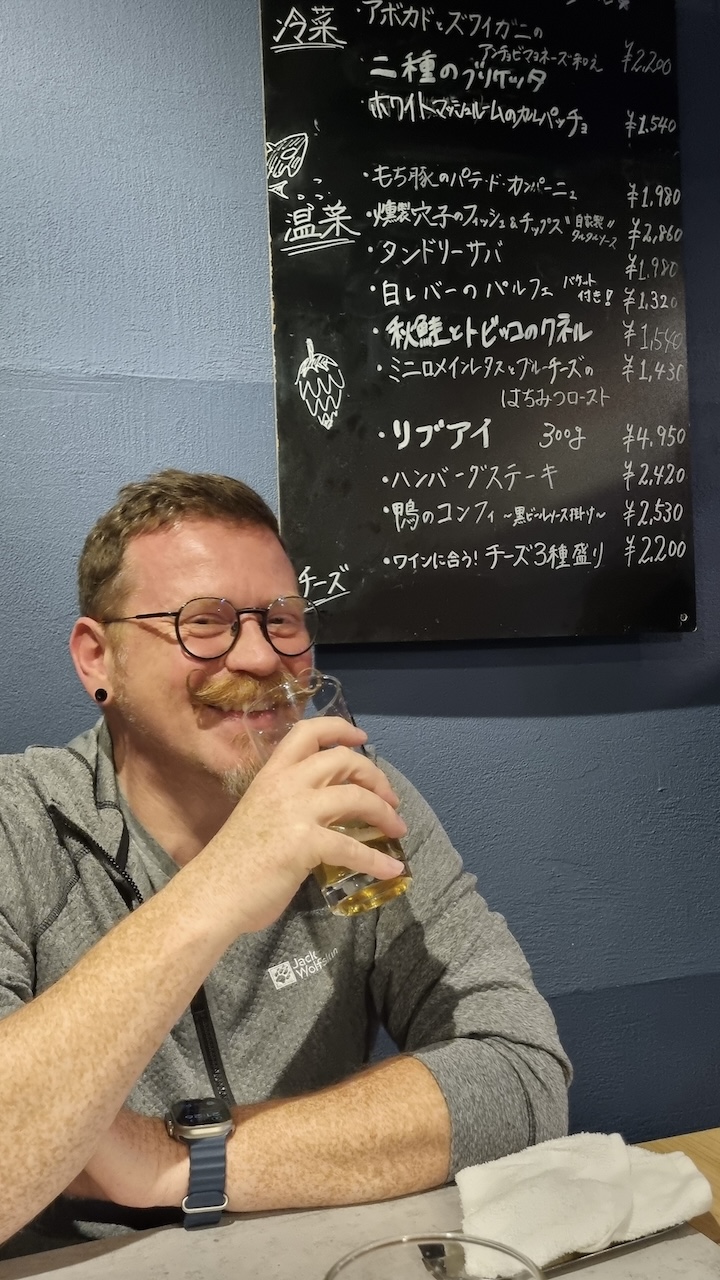 Den Abend haben wir heute gemütlich ausklingen lassen. Wir waren in der Ginza Brewery https://brewinbar.com/ (absolute Empfehlung, wenn ihr mal nach Tokyo kommt). Fritz und ich waren schon vor 2 Jahren in dieser kleinen aber feinen Brauerei. Das Bier und die Snacks schmecken mega und zum Abschluss haben wir uns noch einen japanischen Whiskey gegönnt. Meiner war sehr blumig und angenehm, Fritz seiner roch wie eine Moorbrandleiche. Aber auch, wenn mir so ein torfiges Getränk nicht schmeckt, weiß ich, dass er da einen ziemlichen genialen Whiskey hatte. Das nette Erlebnis war, dass sich der Chef noch an mich bzw. meinen Schnurrbart erinnern konnte. Mein Markenzeichen bleibt einem ewig „eingebrannt“. 🙂 Ich war mir allerdings auch sehr sicher, dass uns er vor zwei Jahren schon bedient hat. Mein Hirn vergisst sowas auch nicht so leicht. hehe Was für ein toller Tag!