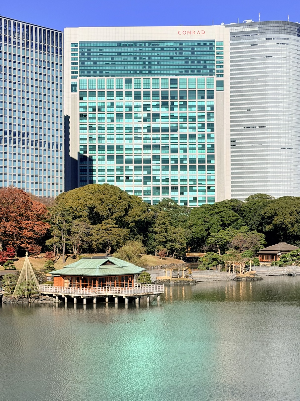 Beim Frühstück habe ich Google Maps geöffnet und plötzlich entdeckt, dass gleich neben unserem Hotel der Hamarikyu Park liegt. Der Hamarikyu Park ist eine ehemalige herrschaftliche Gartenanlage der Tokugawa-Shogune und liegt direkt an der Tokyo Bay, quasi zwischen dem hypermodernen Shiodome-Viertel und dem Wasser. Spannend ist dabei, dass im Shiodome District werktags über 60.000 Menschen arbeiten. Man steht also buchstäblich zwischen einem der geschäftigsten Büroviertel Tokyos und einer stillen Oase aus Kiefern, Teichen und traditionellen Gärten.